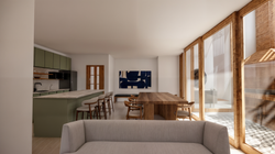 El patio sigue siendo el eje central del proyecto, articulando los espacios y generando una conexión fluida entre el interior y el exterior. En planta baja, un amplio living-comedor se integra con la cocina, separada visualmente por una isla funcional que permite cocinar y disfrutar de las vistas al patio.